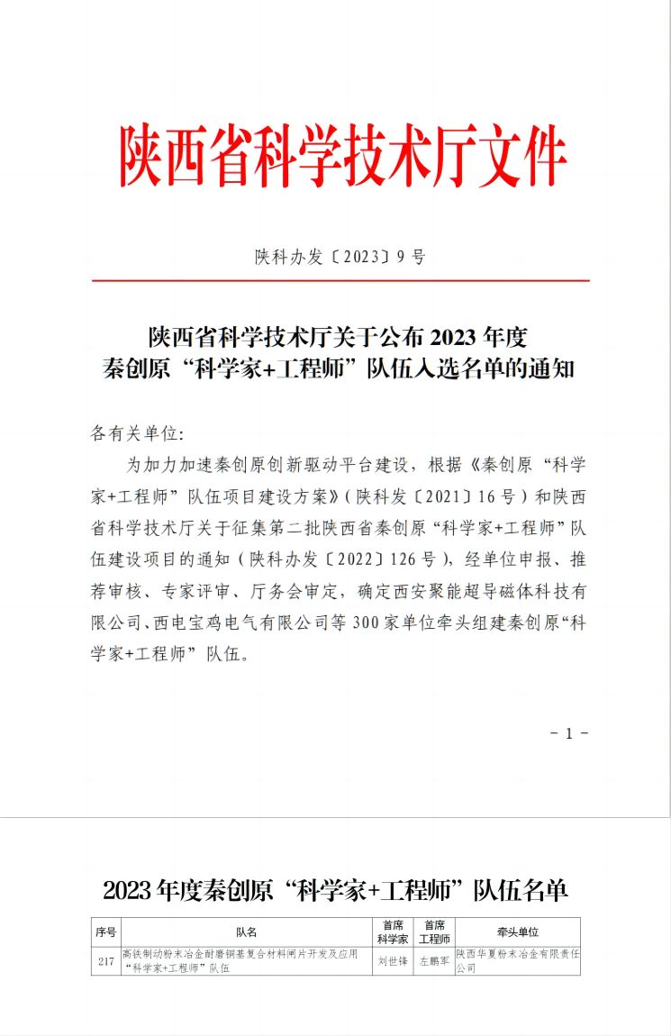 近日,陜西省科技廳公布2023年度秦創(chuàng)原“科學(xué)家+工程師”隊伍入選名單,以陜西華夏粉末冶金有限責(zé)任公司為牽頭單位,公司總經(jīng)理左鵬軍為項目負(fù)責(zé)人(首席工程師)的“高鐵制動粉末冶金耐磨銅基復(fù)合材料閘片開發(fā)及應(yīng)用“科學(xué)家+工程師”隊伍成功入選。