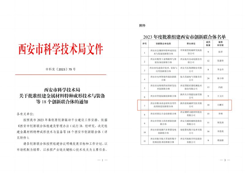 近日,西安市科技局發(fā)布通知,批準(zhǔn)西安市各區(qū)(縣)、開發(fā)區(qū)組建18個(gè)市級(jí)創(chuàng)新聯(lián)合體,我公司牽頭組建的“西安市粉末冶金材料及零件高效制造創(chuàng)新聯(lián)合體”成功入選!