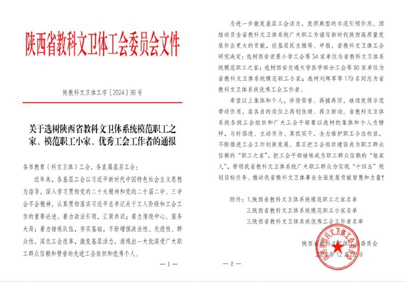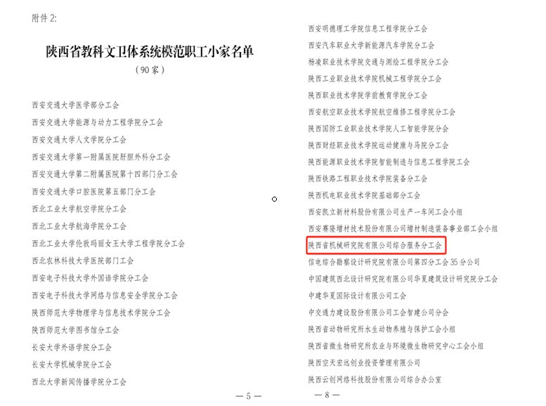 近日,省教科文衛(wèi)體工會(huì)印發(fā)《關(guān)于選樹(shù)陜西省教科文衛(wèi)體系統(tǒng)模范職工之家、模范職工小家、優(yōu)秀工會(huì)工作者的通報(bào)》,機(jī)械院綜合服務(wù)分工會(huì)獲“模范職工小家”榮譽(yù)稱號(hào)。
