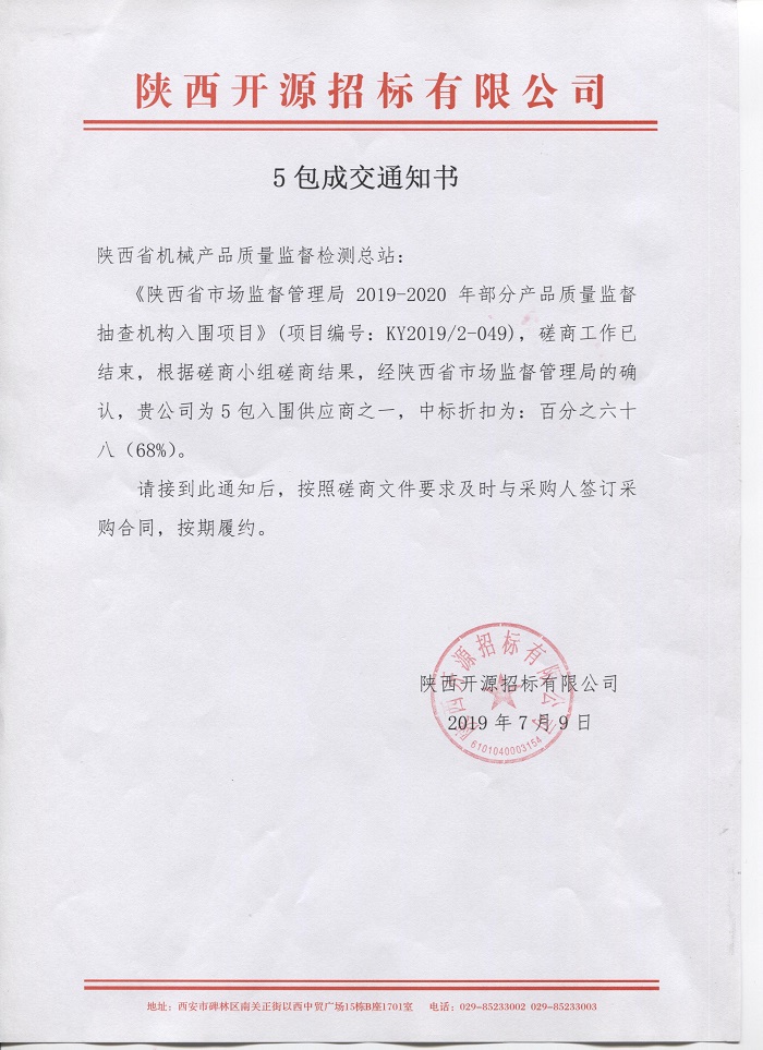 據(jù)陜西省政府采購網(wǎng)消息,陜西開源招標有限公司受陜西省市場監(jiān)督管理局委托,根據(jù)《中華人民共和國政府采購法》等有關(guān)規(guī)定,對2019-2020年度部分產(chǎn)品質(zhì)量監(jiān)督抽查機構(gòu)入圍項目進行競爭性磋商。7月9日,陜西省政府采購網(wǎng)發(fā)布《關(guān)于陜西省市場監(jiān)督管理局2019-2020年部分產(chǎn)品質(zhì)量監(jiān)督抽查機構(gòu)入圍項目的采購結(jié)果公告》,我站申報的3包材料類產(chǎn)品與5包機械及安防產(chǎn)品均中標。